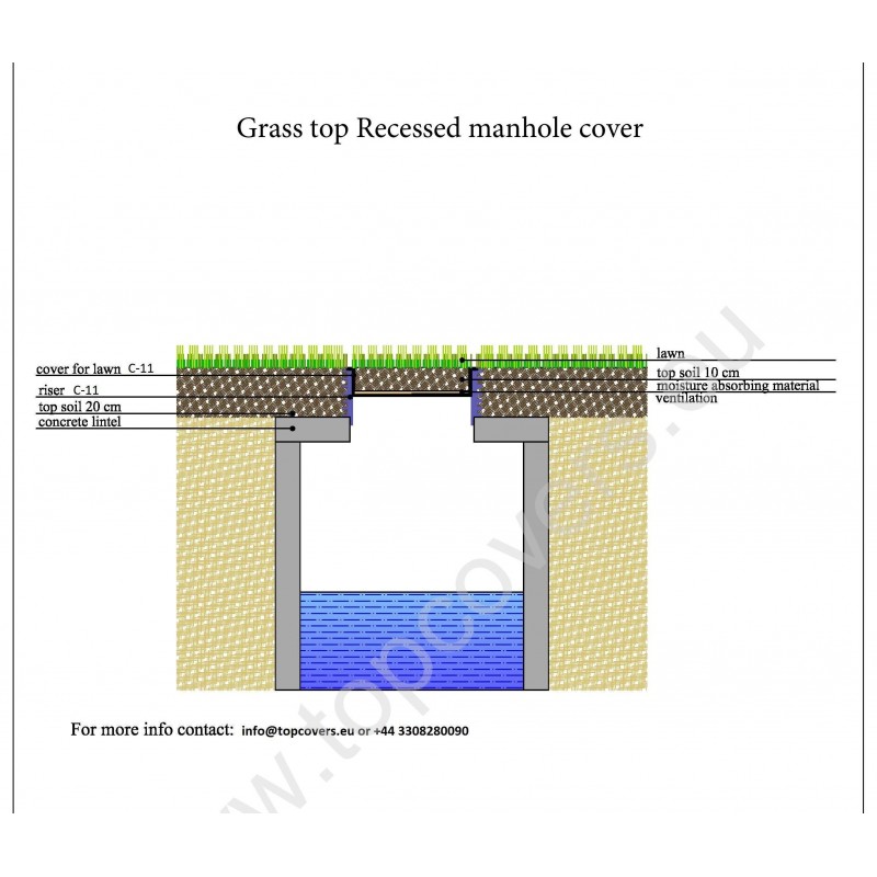 Recessed manhole cover for grass and green areas contain absorbent moisture material, ventilation and drainage.